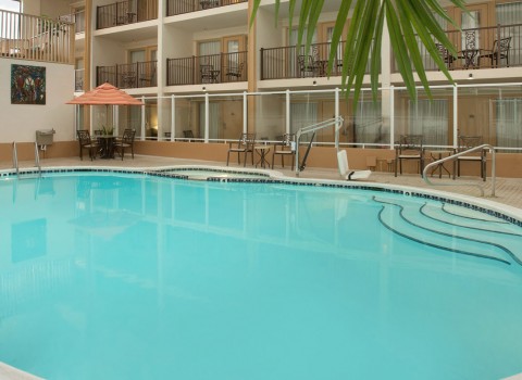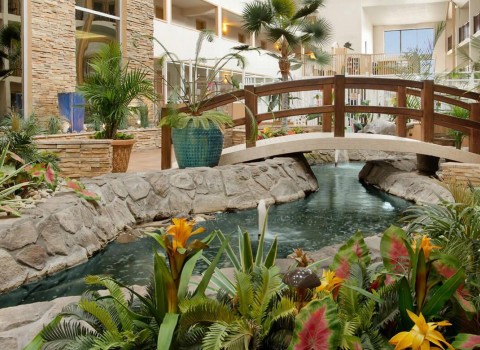 and an outdoor and indoor pool. Exercising is no sweat in our contemporary fitness room. Keeping in touch with your world can be done seamlessly via complimentary Wi-Fi. And you can savor a variety of meals plus refreshing tropical drinks at our charming café and bar nestled in the lush 5-story tropical atrium. Other ammenties include 2 hot tubs, a sauna, business center and tennis court.
